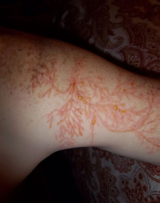 ¿Quieres saber qué marcas te deja un rayo cuando cae sobre tu piel? Pues, si no te achicharra vivo, te deja un bonito dibujo ramificado, que se llama la Figura de Lichtenberg, y que muestra la forma como se mueve la electricidad por tu piel al recibir la descarga. Como un tatuaje, pero a lo bestia e instantáneo. ¡Ah! y también gratis.